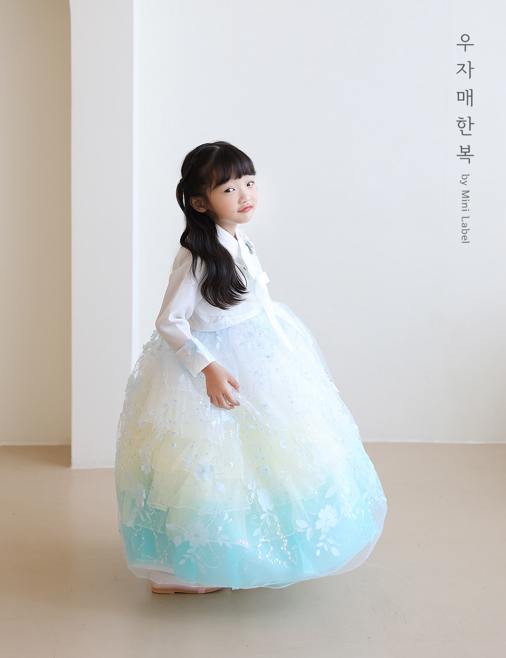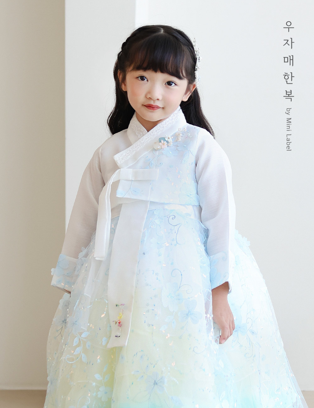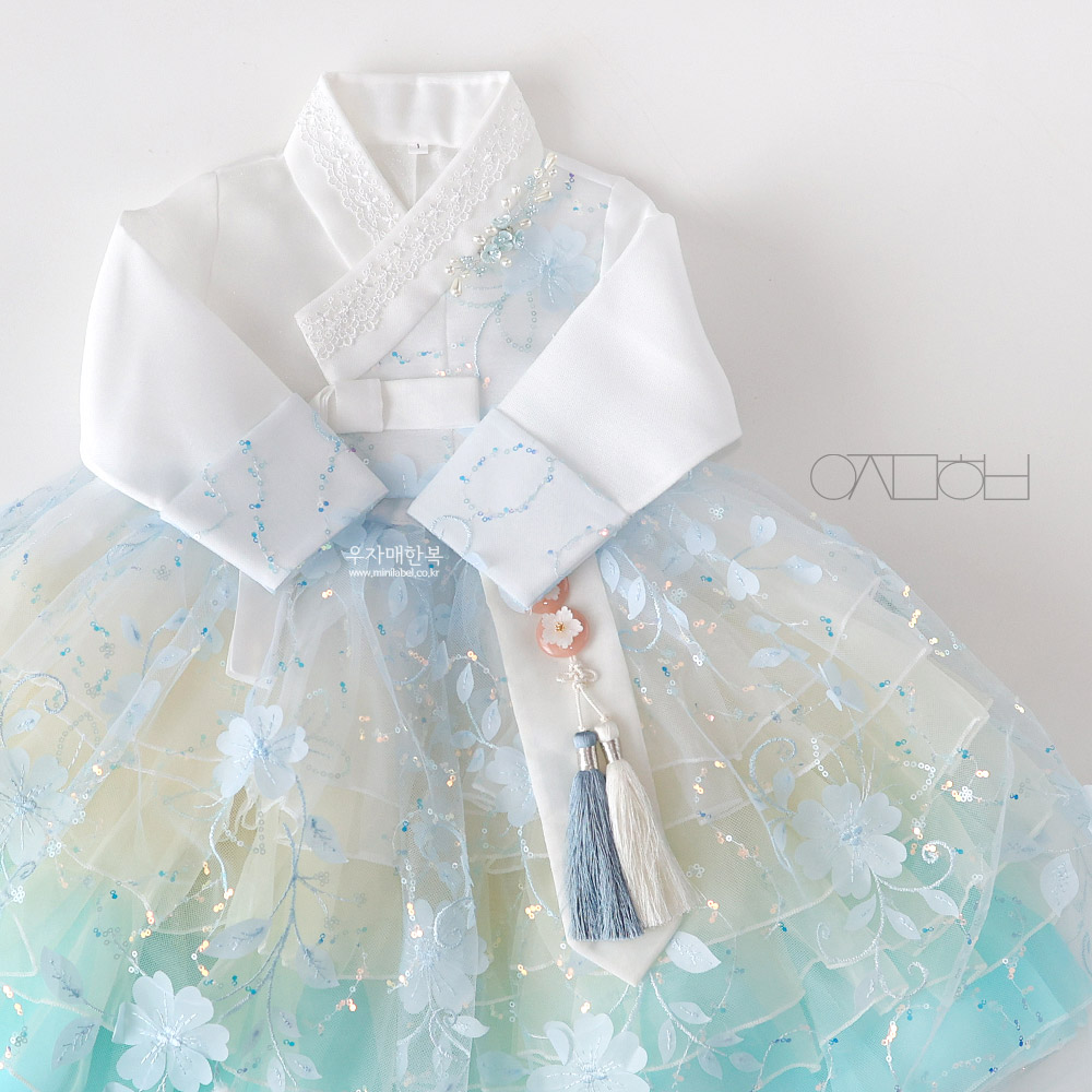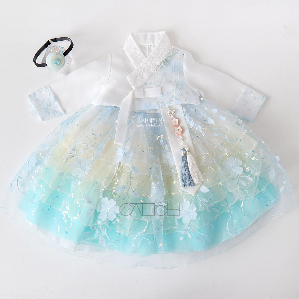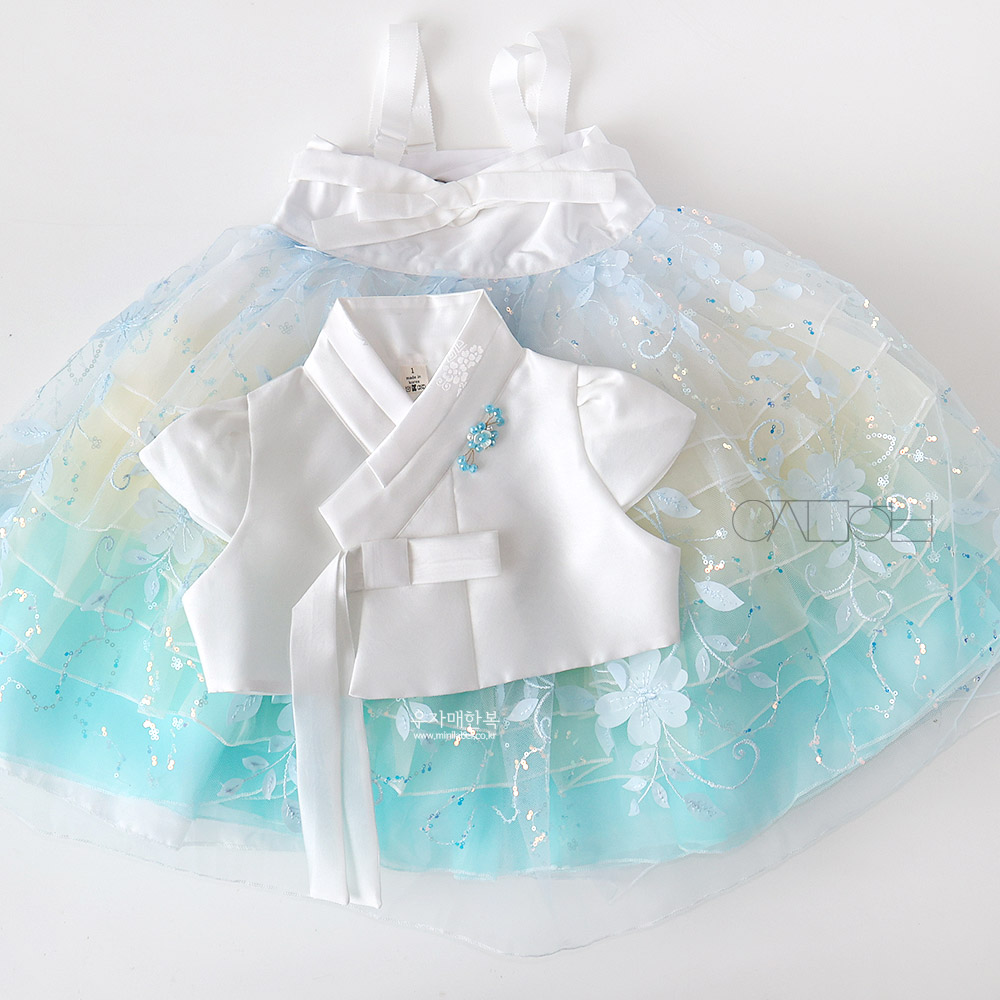 청량한 푸른 오로라빛으로 예쁜 공주 드레스한복입니다.