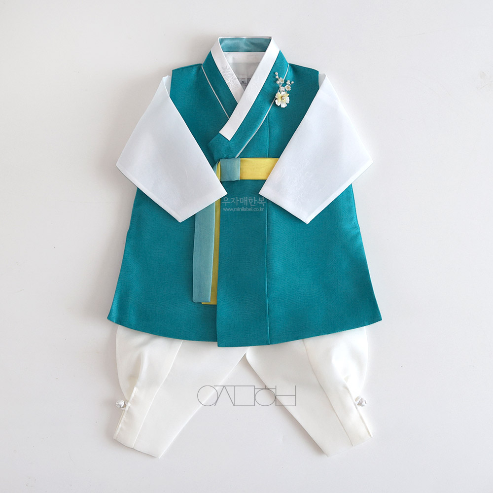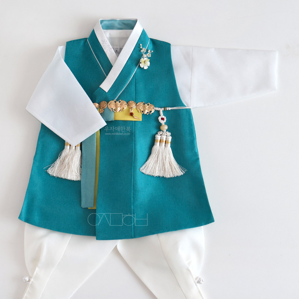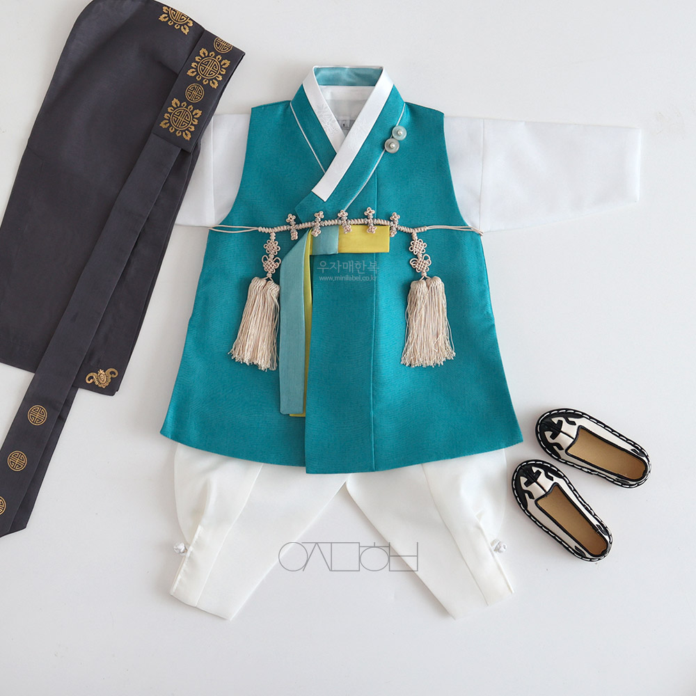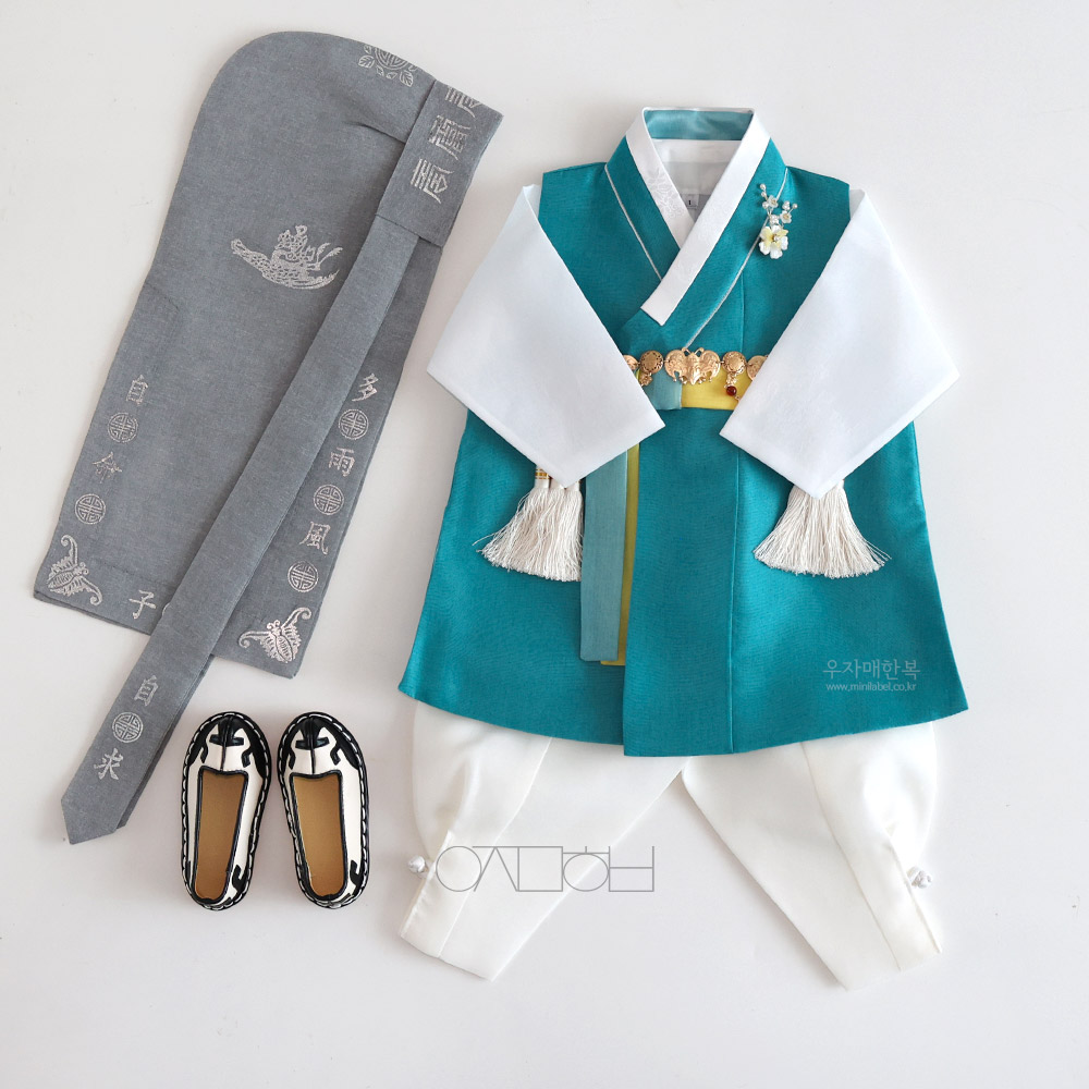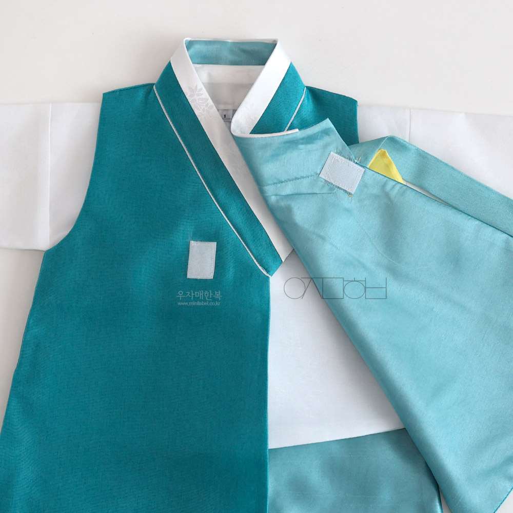 맑고 시원하면서도 차분하고 편안한 느낌을 동시에 주는 매력적인 청록색 쾌자로 제작된 남아한복입니다.