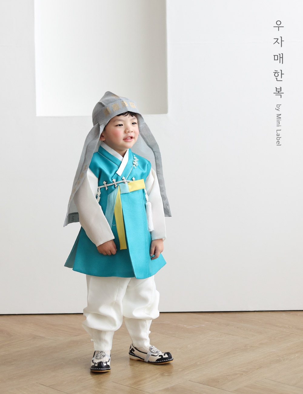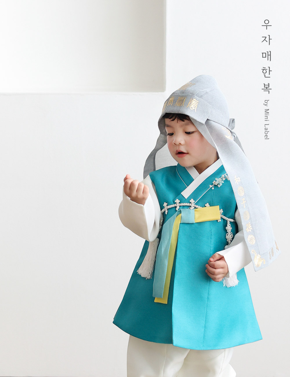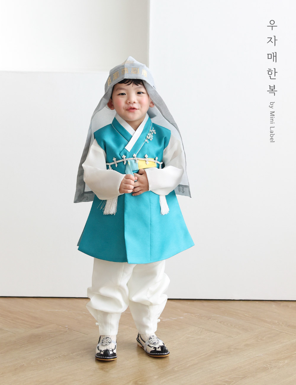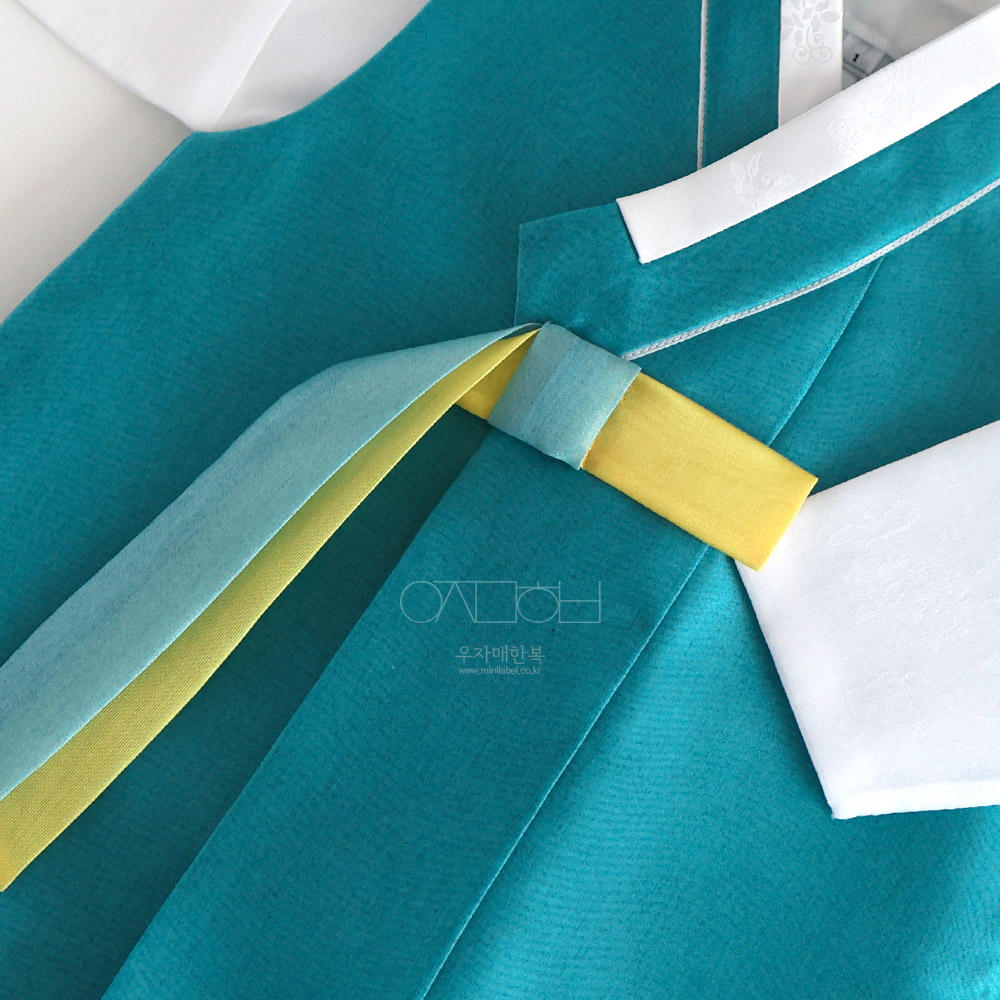 맑고 시원하면서도 차분하고 편안한 느낌을 동시에 주는 매력적인 청록색 쾌자로 제작된 남아한복입니다.